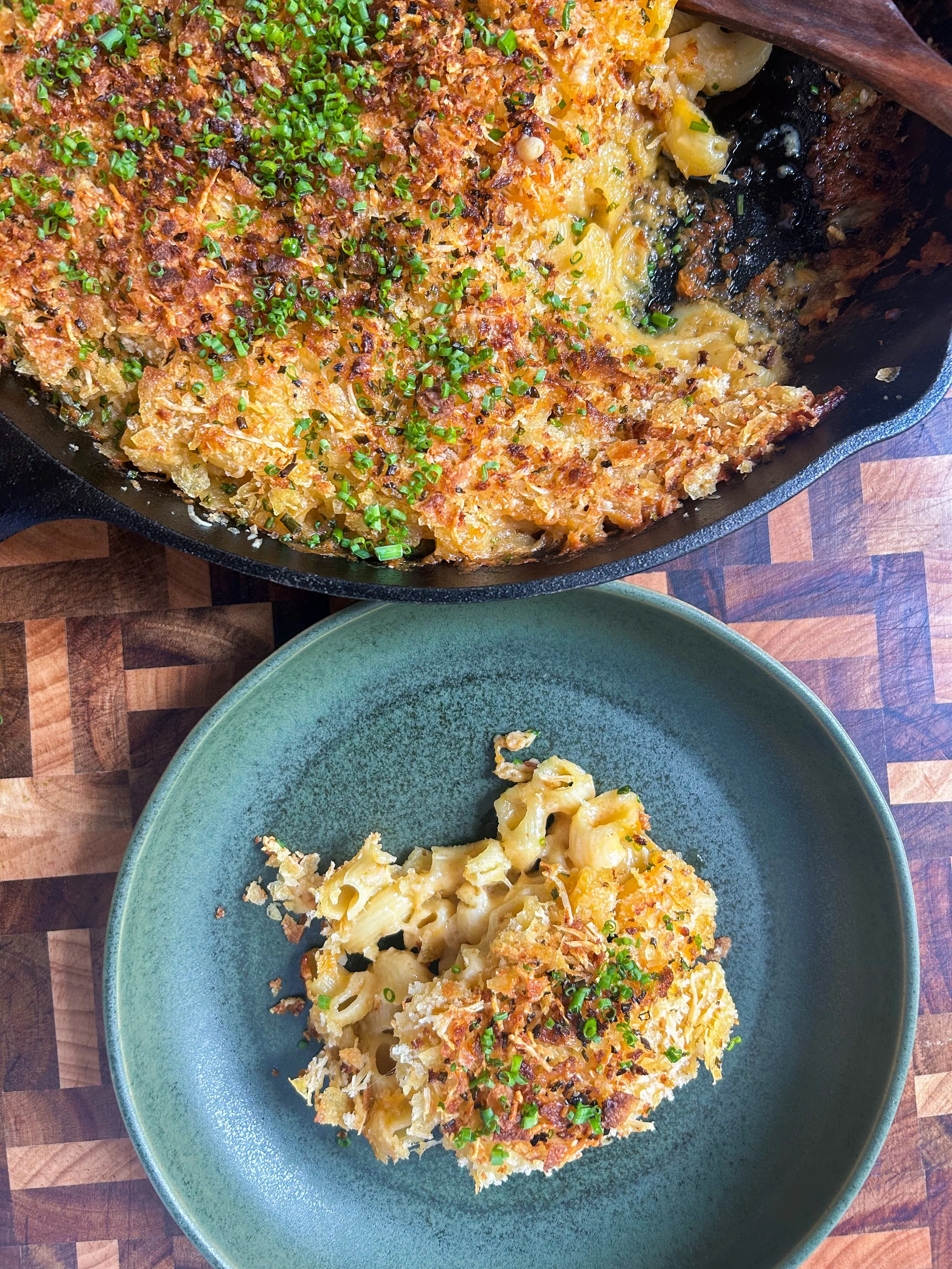 Remove the bay leaf after simmering the béchamel. Add in the grated cheese a little at a time, mascarpone, and Dijon. Stir until smooth over low heat until all the cheese is incorporated and melted. Adjust seasoning as needed, Pour over the pasta. Mix until thoroughly combined. Spread into a 12 inch cast iron skillet lightly greased with butter. Top with extra grated cheese of choice to create an even layer. Top with the potato chip topping to coat the entire skillet. Finish with little pats of butter spread out over the topping. Place in the oven until golden brown and bubbly, about 15 minutes. Garnish with chopped chives.